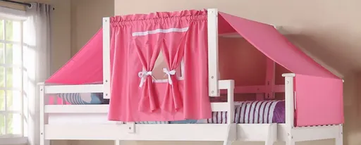 Every child wants to play or sleep under a tent. Now they can have one under their bunk bed, with this combination pink fabric and the White finished wood tent kit color. The tent kit will work on any Donco Kids twin bunk top or loft bed.
