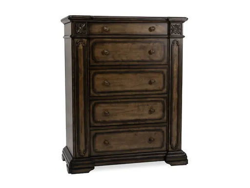 The Doral Chest brings refined elegance and practical storage to your bedroom. Crafted from acacia solids and veneers with a rich walnut finish, this chest features five spacious drawers, including a felt-lined top drawer for delicate items. Ornate detailing adds a touch of timeless sophistication, making it a perfect match for classic or traditional bedroom decor. Durable and stylish, the Doral Chest is a standout piece designed to enhance both function and beauty in your space.