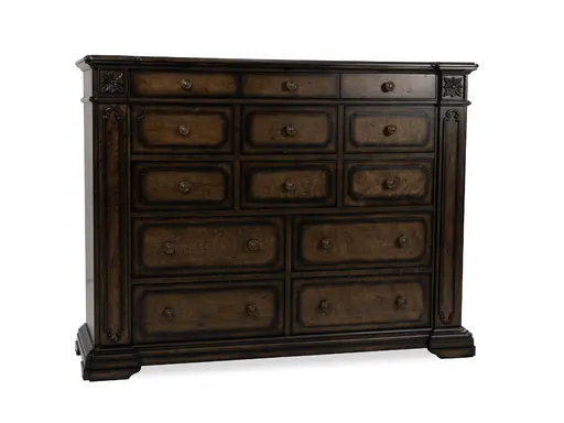 The Doral Gentleman’s Chest is a masterful blend of functionality and elegance. Constructed from acacia solids and veneers with a rich walnut finish, this chest offers an impressive 13 drawers for ample storage, making it ideal for organizing clothing, accessories, and more. Felt-lined drawers protect delicate items, while the ornate detailing adds a timeless, sophisticated touch. A standout piece for those who value both style and practicality, the Doral Gentleman’s Chest is perfect for elevating your bedroom decor.