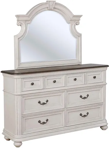 The Dynasty Dresser and Mirror set is a timeless addition to your bedroom, seamlessly blending traditional design elements with classic elegance. The dresser, finished in a weathered white color with a rich brown top, features eight drawers that offer generous storage space for your wardrobe. Crafted from pine solids and oak veneers, the dresser exudes both durability and refined craftsmanship. The beading detailing with a solid wood edge, framed drawer fronts, and detailed bracket feet contribute to the dresser's traditional charm. The English dovetail drawers showcase meticulous construction, ensuring lasting quality. The detailed white wood mirror complements the dresser, enhancing the overall aesthetic. Elevate your bedroom with the Dynasty Dresser and Mirror set, where thoughtful design and superior materials create a sophisticated and enduring ensemble.