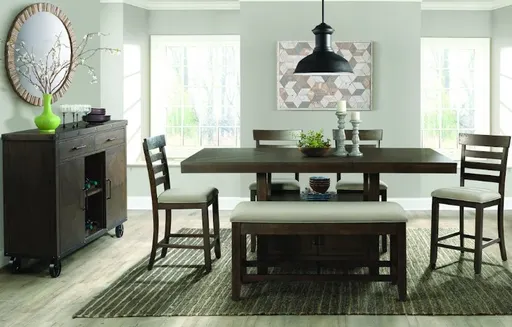 The Colorado counter height dining brings boldness to a dining scheme. With a trestle base design and a deep charcoal finish, this everyday counter height table serves as a perfect gathering space.