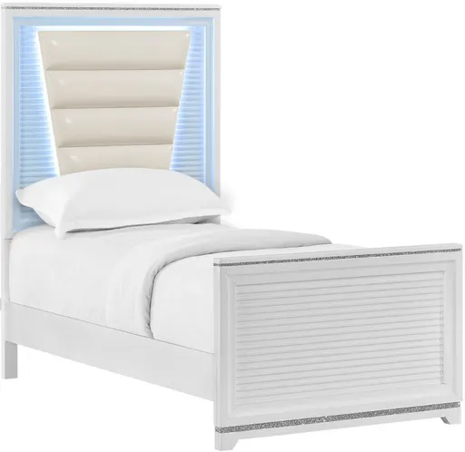 The Denmark White Twin Upholstered Panel Bed with LED brings modern elegance to any bedroom. Featuring a sleek white upholstered design, it offers a clean, contemporary look. Built-in LED lighting adds a stylish touch, while the sturdy construction ensures lasting durability, making it a perfect blend of style and function.