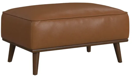 The Destiny Ottoman with Wood Base exudes the coveted charm of mid-century modern style. Built with framing of quality solid and engineered wood that is full upholstered in quality faux leather, this piece is built for durability. Comfortable foam cushioning and exposed wood legs mark thoughtful design.
