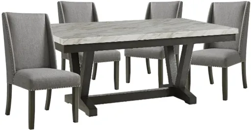 Enhance your dining space with the Everdeen 5-piece gray/white standard height dining set. Featuring a sleek gray tabletop with a crisp white base and four matching chairs, this set combines modern design with comfortable seating—perfect for casual meals and stylish entertaining.
