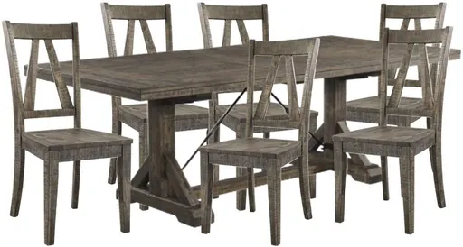 This dining set is dressed in a dark walnut finish making it the perfect addition to any dining room. This handsome trestle style table features a removable leaf for added space. The back of the wooden side chairs are designed to match the trestles of the table with the same angled panels.