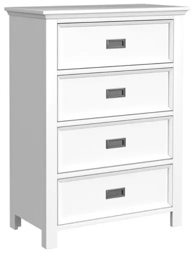 Complement your child’s bedroom with the modern sophistication of the Hampton Kids 4-Drawer Chest in White. Designed with durability in mind, this chest’s frame is built with solid wood and finished with a quality, grained oak veneer.