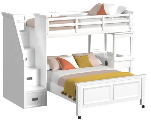 Maximize your child’s bedroom space with the Hampton Kids Twin Over Full Loft with Staircase and Desk with Speakers. Designed with stability in mind, this piece is built of solid and engineered wood with a grained oak veneer, creating the illusion of depth.