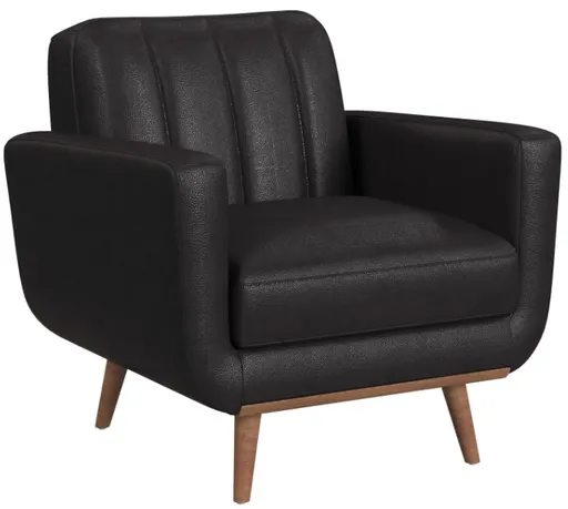 The Horizon chair with wood front is built with a frame fully upholstered in quality faux leather. Comfortable foam cushioning, decorative tufting on the backrest, and track arms forming sleek and modern lines, while an exposed front rail and wood legs highlight excellent craftsmanship.
