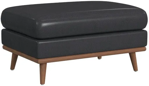 The Horizon ottoman with wood base in pebble navy exudes the coveted charm. Built with a wood frame that is full upholstered in quality faux leather. Comfortable foam cushioning and exposed wood legs mark thoughtful design, while the piece freestanding nature permits versatility in utility and staging options.