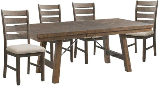 The Jax 5-piece dining set makes rustic entertaining easy. Its cherry finish and earthy wood grain detail create an organic look that's both inviting and relaxing. Flared legs, turnbuckle metal accents, and ladder back side chair add a contemporary flavor to this charming set.