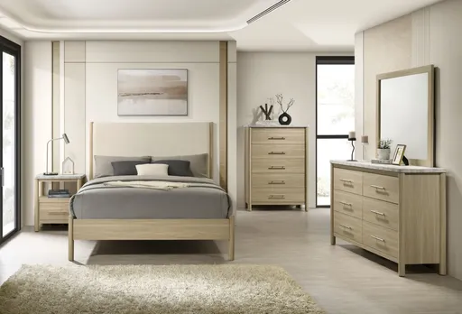The Jonas nightstand pairs natural warmth with modern convenience, featuring a smooth natural wood finish and an elegant faux-marble paper top. Its compact design includes a single storage drawer and a built-in USB port, making it a stylish and functional bedside essential for contemporary living.