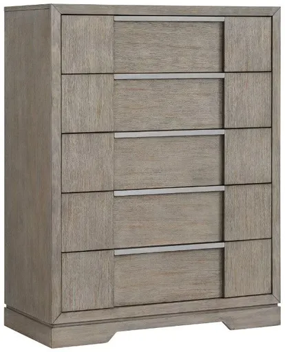 The Kelis chest is a storage solution with a touch of elegance. Its sleek gray finish complements any bedroom decor. With five spacious drawers, it offers ample storage space for clothes and accessories, combining style and functionality seamlessly for organized living.