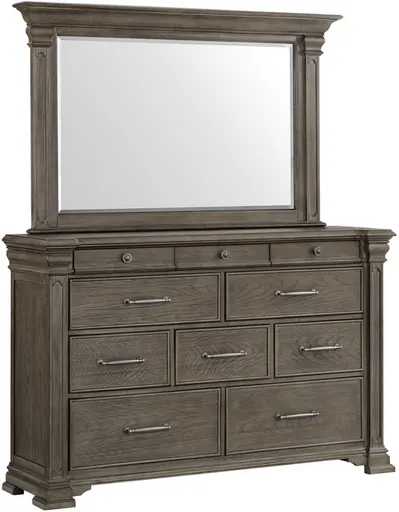 Enhance your bedroom with the elegant Kings Court gray dresser and mirror set. Featuring a sleek gray finish, multiple spacious drawers, and a matching framed mirror, this duo offers stylish storage and a polished lookperfect for organizing essentials while adding sophistication to your space.
