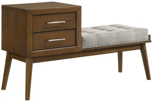 The Malibu bench with gray fabric in walnut is constructed with high-quality solid and engineered wood and an aesthetic walnut veneer. Two storage drawers built with skillful dovetailing and smooth center metal glides offer convenient storage space for your essentials, while the tufted, upholstered seat provides comfortable place to rest.