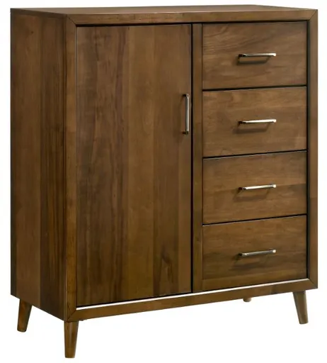 The Elements International Malibu Walnut 4-Drawer Chest epitomizes sophistication and functionality. Crafted with exquisite walnut veneers, its sleek design adds a touch of elegance to any bedroom. With four spacious drawers, it offers ample storage for clothing and essentials, while its sturdy construction ensures durability and longevity.
