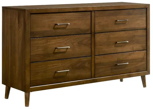 The Elements International Malibu Walnut 6-Drawer Dresser exudes timeless elegance and functionality. Crafted with exquisite attention to detail, it boasts a rich walnut finish that adds warmth to any space. With four spacious drawers, it offers ample storage for your clothing and essentials while enhancing the ambiance of your bedroom décor.
