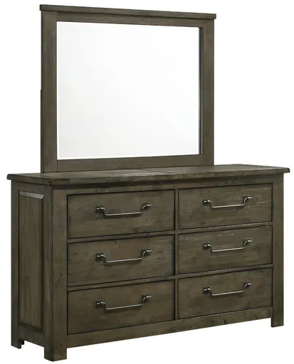 This rustic-chic duofeaturing a six-drawer dresser and matching mirrorin a cozy antique gray finish brings farmhouse charm to your bedroom. Crafted from sturdy solids and veneers with weathered wood grain detailing, the set offers practical luxury with felt-lined drawers, metal hardware, and anti-tip safety features.