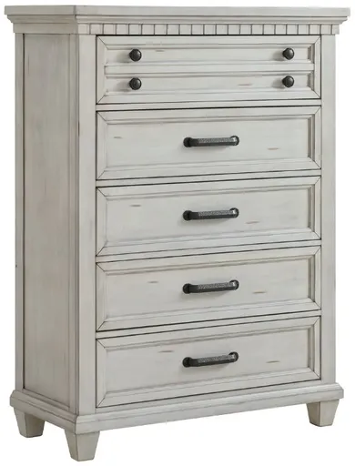 The McCoy antique white chest offers timeless elegance to any bedroom. Its charming antique white finish adds a touch of vintage appeal. With five spacious drawers, it provides ample storage space for clothing and essentials, blending classic design with practical organization for a refined living space.