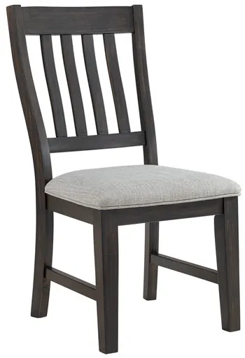 A comfortable, upholstered side-chair combining a dark espresso-toned wood frame with a light-gray padded seat and back offering a balanced, clean look suitable for dining rooms, kitchens, or casual dining spaces. The chair blends comfort and style, making it a versatile seating option for daily meals.