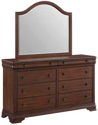 This dresser and mirror is the epitome of elegance and sophistication. With its sleek curved mirror and stained drawer panels, this piece will add a touch of luxury to any bedroom. The beveled edges feature a decorative touch and enhance its refined look.