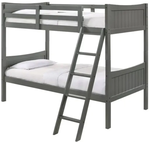 Transform your child's bedroom with Sami twin over twin bunk bed. Crafted in and finished in a rich gray. Featuring clean lines and a built-in stepladder. This bunk bed is a space saver, leaving plenty of room for other décor and furniture. Sturdy, stylish, and safe the Sami Bunk Bed is the perfect transitional piece to add to your child's space.