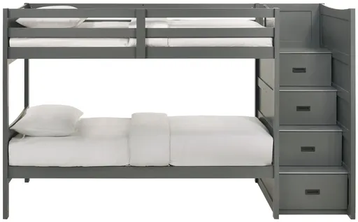 The Sami twin over twin step bunk bed combines space-saving design with practical storage for youth bedrooms. Finished in gray, it features four step-integrated drawers for organized essentials. With a right-side headboard and sturdy construction, this bed offers durability and style while maximizing room layout and everyday comfort.