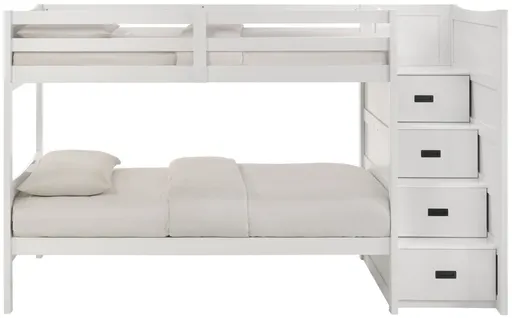 The Sami twin over twin step bunk bed combines space-saving design with practical storage for youth bedrooms. Finished in white, it features four step-integrated drawers for organized essentials. With a right-side headboard and sturdy construction, this bed offers durability and style while maximizing room layout and everyday comfort.
