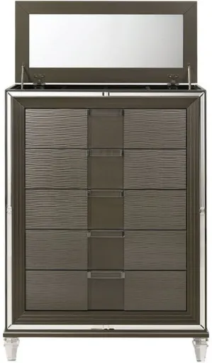 Bring dazzling style while making the most of the space you have in your bedroom with this chest of drawers. With plenty of spots to stow away your favorite items of clothing, this chest also includes a stylish lift top mirror for your to admire your outfit in each morning.