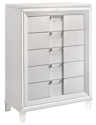The sophisticated Twenty Nine bedroom collection features a white finish paired with acrylic hardware and feet. This chest has solid plywood framing, and felt lined top drawers. The perfect addition to your bedroom.
