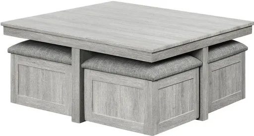 Beautiful and functional, this living room table set includes a square coffee table and 4 upholstered stools that can be used to accommodate extra seating and fits perfectly under the table when not in use. Each stool features a lift top seat that reveals extra storage space, perfect for kids, game night, you name it!