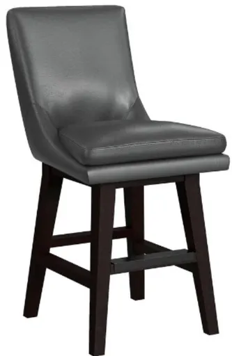 The Elements International Villanova Brown Swivel Counter Stool features a rustic yet stylish design. It has a dark brown wood finish with a comfortable cushioned seat upholstered in a matching fabric. The stool offers a 360-degree swivel function, a sturdy footrest, and elegant curved back detailing for added support.