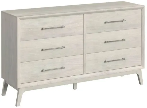 Features a warm, almond finish with a clean, classic design. Its six spacious drawers provide ample storage, making it a stylish and functional addition to any bedroom, perfect for organizing clothes and essentials.