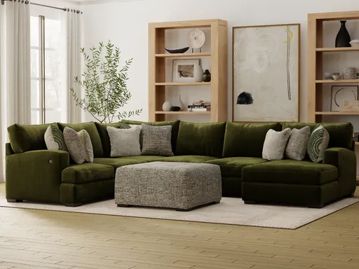The Evergreen Sectional is a stunning addition to any modern living space. This three-piece sectional is upholstered in 100% Polyester Lucious Pine colored multidimensional chenille fabric, which adds a touch of elegance and warmth to your home. The sectional features "T" cushion styling and deep seating for ultimate comfort. The reversible dacron crowned seat cushions ensure durability and long-lasting support. The sectional also includes loose and reversible back cushions, allowing you to customize your comfort. The outside arms are equipped with USB/USBC ports, providing convenient charging options for your devices. Additionally, the sectional comes with coordinating designer toss pillows, adding a pop of color and style to the ensemble. As a bonus, a free cocktail ottoman is included, adding versatility and functionality to your living space. Upgrade your home with the Evergreen Sectional and enjoy luxurious comfort and contemporary style.
