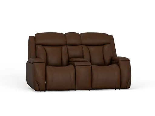 Designed for comfort and connection, the Frequency Leather Console Loveseat brings a theater style experience right into your home. With its rich brown leather look and built in console, it creates the perfect spot for movie nights or relaxing evenings.
