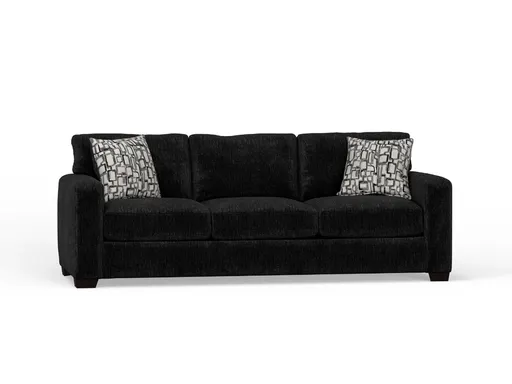 The Gayle Sofa delivers a clean, modern look with quality construction that’s built to last. Upholstered in a rich charcoal-colored 100% polyester fabric, this stationary sofa features a sleek silhouette with square arms for a streamlined and versatile design. Two accent pillows in a bold geometric pattern of greys and white add a touch of visual interest, bringing personality and contrast to the neutral base. The Gayle is an easy fit for contemporary, transitional, or minimalist spaces.