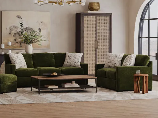 The Gemma Sofa and Loveseat Set brings coordinated style, lasting comfort, and dependable construction to your living room. Both pieces are upholstered in a vibrant green 100% polyester fabric that adds a bold yet versatile pop of color to your home while standing up to everyday wear. Clean lines and a modern silhouette give this set a fresh, contemporary feel, making it an ideal centerpiece for gatherings, relaxing evenings, or family movie nights.