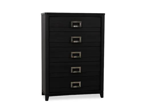 The Godfrey Chest offers a stylish storage solution with a sleek modern design that elevates any bedroom. Crafted from durable MDF and engineered wood in a bold black finish, this chest features gently sloping drawer fronts that add a graceful, contemporary touch. The silver square hardware provides a crisp contrast, highlighting the clean lines and refined profile. With five spacious drawers, including a felt-lined top drawer for delicate items, the Godfrey Chest provides ample storage while maintaining a streamlined, sophisticated look.