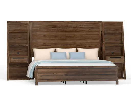 The Guthrie Wall Bed combines rustic elegance with modern functionality, available in king or queen sizes. Crafted from pine solids and veneers in a warm rustic driftwood finish, this bed features two shelved piers on either side of the headboard in an A-frame design that widens toward the floor. Each pier includes a convenient drawer with black hardware, USB Type A & C ports, and touch light controls for the integrated LED lighting beneath the shelves. Perfect for creating a cozy, organized bedroom, the Guthrie Wall Bed blends timeless style with thoughtful features.