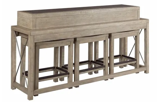 The West End bar console has a bluestone inset top and comes with three barstools included. The bar stools have wood seats, wood legs and metal cap footrests. West End was inspired by clean,vparson style designs. Incorporating classic elements in metal with accents of bluestone.