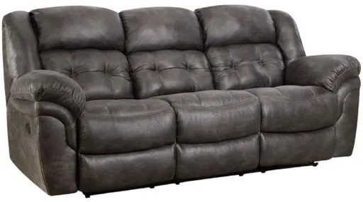 The Frontier double reclining sofa in charcoal features a sleek design with double needle accent stitching, adding a touch of sophistication to any living space. The tufted seats and back provide both comfort and style, while the plush, pad-over chaise leg support ensures optimal relaxation.