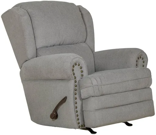 Plush comfort describes the Singletary Rocker Recliner from Jackson Furniture. Shown in nickel upholstery. It features padded back and seat cushions, and padded rolled arms. It has a nailhead trim on the arms.