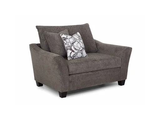 The Jocelyn Chair and a Half delivers oversized comfort and modern style, perfect for lounging, reading, or relaxing with extra space to stretch out. Upholstered in a dark brown 100 percent polyester fabric, this stationary chair features flared arms and wooden legs for a clean, contemporary look. Two coordinating throw pillows complete the design, one in matching brown fabric and the other in a cream-colored abstract circle pattern that adds a light visual contrast.