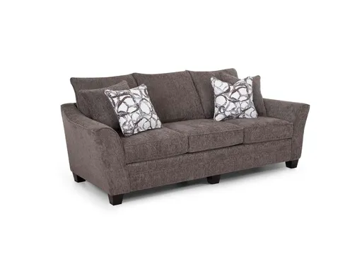 The Jocelyn Sofa brings a warm, modern feel to your living space with its rich dark brown fabric and clean, flared arm design. Upholstered in 100 percent polyester, it offers durability and a soft hand-feel, making it ideal for everyday use. Wooden legs provide a sturdy base while adding a touch of natural texture. Four coordinating throw pillows complete the look, with two in matching brown fabric for cohesion and two in a light cream abstract circle pattern that adds just the right pop of contrast.