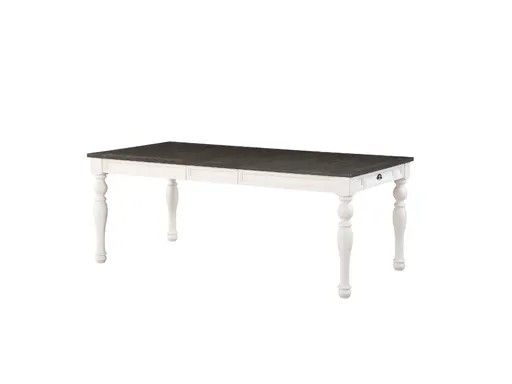 Immerse your dining space in the timeless allure of the Kara Dining Table, a perfect embodiment of classic farmhouse styling with a modern twist. Constructed from acacia veneers and hardwood solids, this table boasts a captivating two-tone ivory and mocha finish that adds a touch of sophistication to any setting. The table's versatile design allows it to extend to 80” with the inclusion of a 16” leaf, accommodating various dining needs and settings. Adding to its practicality, the table features a working drawer, seamlessly combining style and functionality. Elevate your dining experience with the Kara Dining Table, where classic farmhouse aesthetics meet the demands of contemporary living.