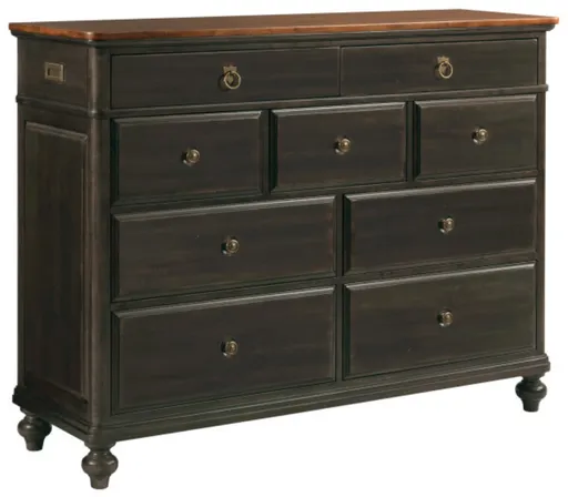 The Bridgetown Harrison Bureau Chest by Kincaid® combines timeless elegance with practical functionality. Crafted from solid wood, it features a sleek black finish, nine spacious drawers, and refined details, making it a versatile and stylish storage solution for any home.