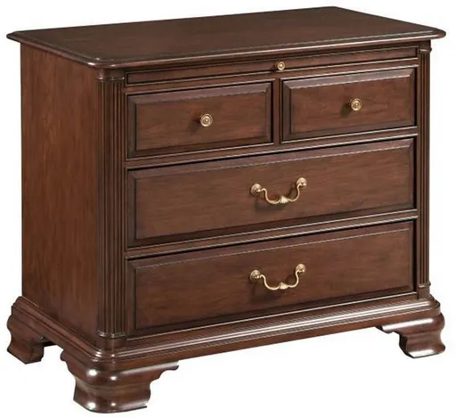 A classic, solid cherry bedside piece in a master bedroom scale. The Hadleigh bachelor's chest is designed in a larger format bringing the total storage to four drawers for increased organization. It also adds space for a pull-out tray which features a laminated surface for hot or cold beverages.