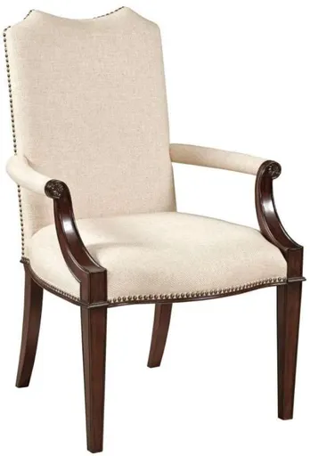 The Hadleigh collection features distinctive dining chair designs. The upholstered armchair shown here offers a terrific blend of comfort and elegant styling. While the silhouette is cleaner and uncluttered than most traditional dining chair designs, it maintains several details that add personality to the dining room.
