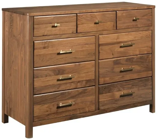 The flat top nine drawer dresser is a clothing storage masterpiece. Among the nine full-depth drawers in this high-waisted dresser, there are six large drawers with three medium sized drawers across the top.