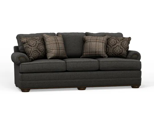 The Kirsten Sofa blends traditional charm with cozy comfort, making it a timeless addition to any living space. Upholstered in a soft grey 100 percent polyester chenille fabric, this sofa offers a plush feel with a classic look. Rolled arms adorned with nailhead trim add elegant detail, while the bun feet and T-cushion design enhance the traditional silhouette.