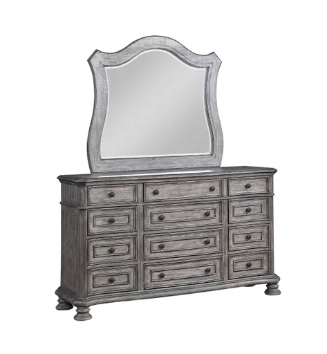Immerse your bedroom in the allure of the Lakeway Dresser and Mirror, a masterpiece in sandblasted grey pecan finish that artfully reveals the intricacies of every grain. Crafted with precision from high-quality poplar solids and veneers, this dresser is a testament to meticulous design and enduring elegance.The attention to detail is evident in the twelve drawers that offer ample storage space, each thoughtfully constructed to provide both style and functionality. The cedar-lined bottom drawers not only add a touch of luxury but also ensure the preservation of your most cherished garments.The accompanying mirror completes the ensemble, reflecting the impeccable craftsmanship and enhancing the visual appeal of your space. Elevate your bedroom decor with the Lakeway Dresser and Mirror, where the sandblasted grey pecan finish meets superior construction, creating a statement piece that stands the test of time. Redefine your living space with a touch of sophistication and unparalleled quality.